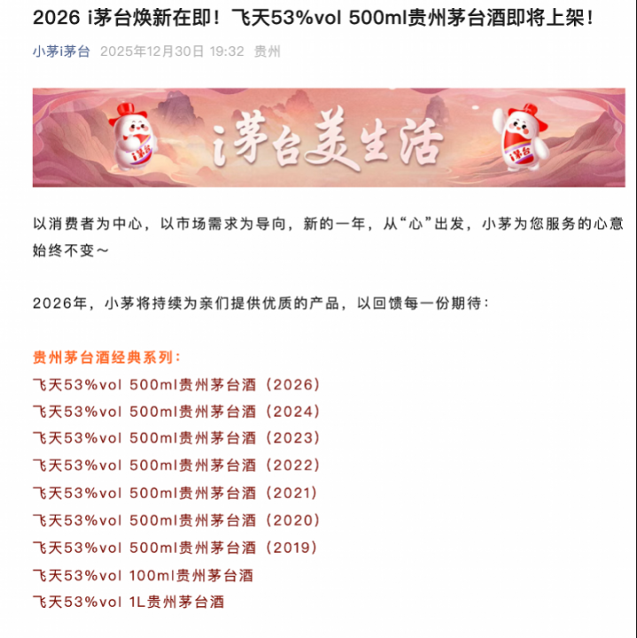 12月30日晚,南都湾财社-酒水新消费指数课题组记者注意到,i茅台正式宣布,2026年将调整贵州茅台酒上架产品矩阵,主要有经典(飞天茅台)、精品、生肖、陈年、文化、低度酒等6大系列,这其中涵盖53%vol500ml飞天贵州茅台酒等多款茅台酒产品。
