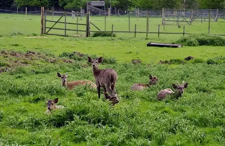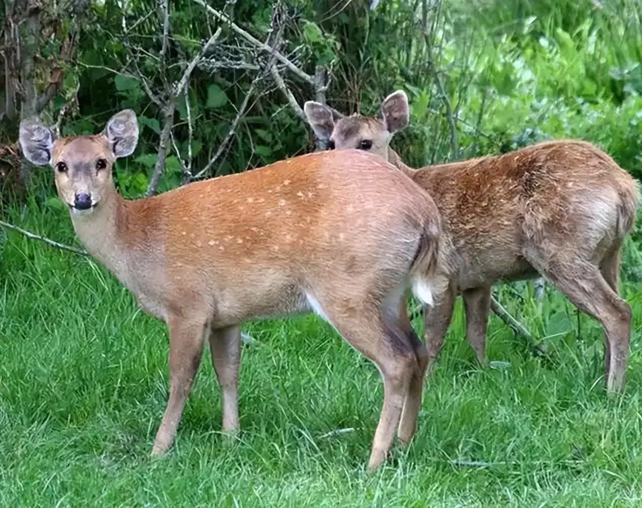 在夏季,豚鹿的体毛呈棕黄色或淡褐色,体表分布着许多不规则的白色斑点,这些斑点如同天然的伪装,使其在夏季茂密的植被中不易被天敌发现。